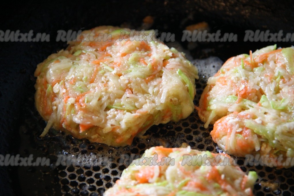 На разогретую сковороду налить немного растительного масла. С помощью столовой ложки выкладывать овощную массу на сковороду. Также можете сформировать драники руками в виде приплюснутых округлых котлеток. Жарить драники из кабачков, картофеля и моркови до румяности на очень медленном огне с двух сторон, чтобы они хорошенько прожарились и не остались сырыми.