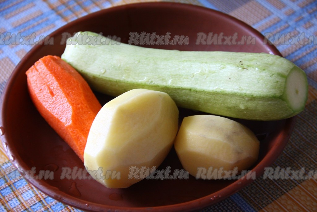 Картофель, кабачок и морковку очистить и вымыть. Если кабачок молодой, то его можно не очищать от шкурки и семечек.