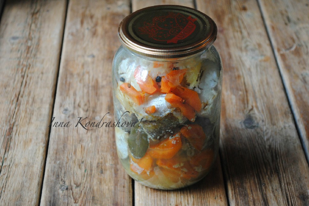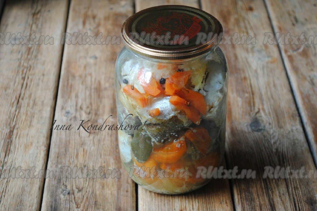 Подготовить чистую, сухую стеклянную банку (у меня рыба с овощами поместилась в литровую банку). Выложить рыбу в банку, чередуя с овощами. Каждый слой нужно солить и перчить. Также выложить в банку лавровые листья и душистый перец.