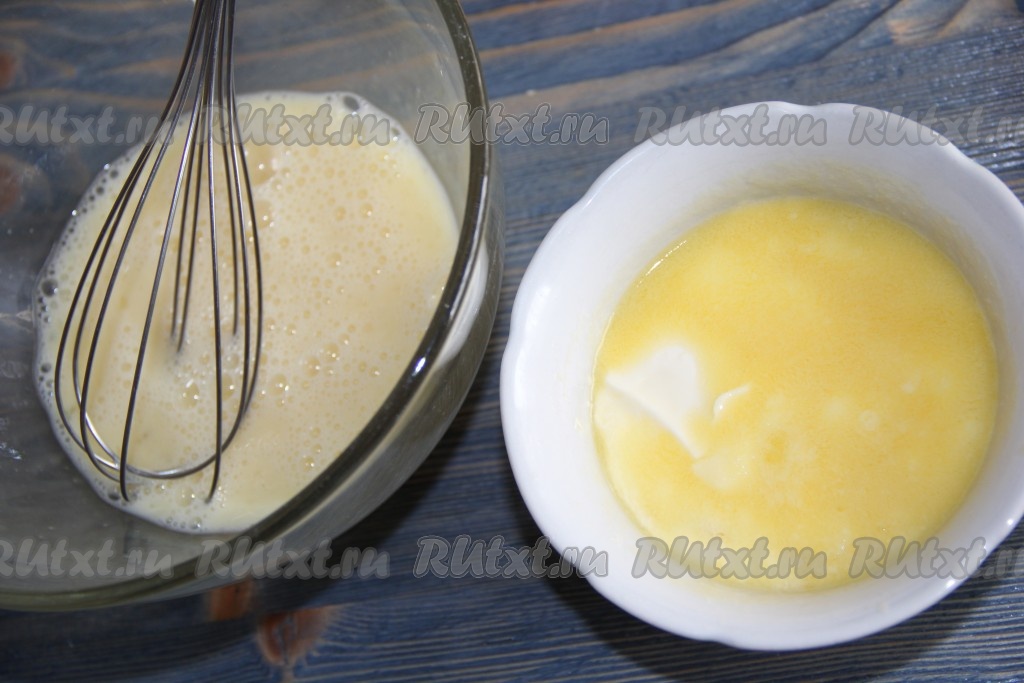 Влить маргарин в яичную массу и перемешать венчиком.