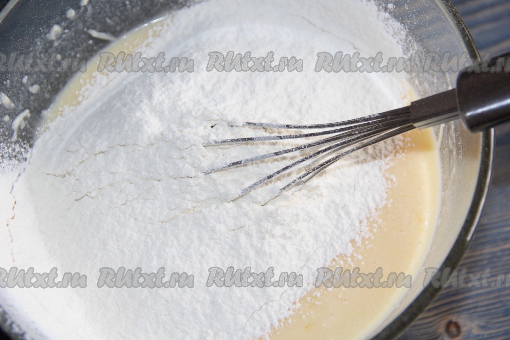 Перемешать массу, добавить молоко. Затем добавить просеянную муку и соль, перемешать получившееся тесто.