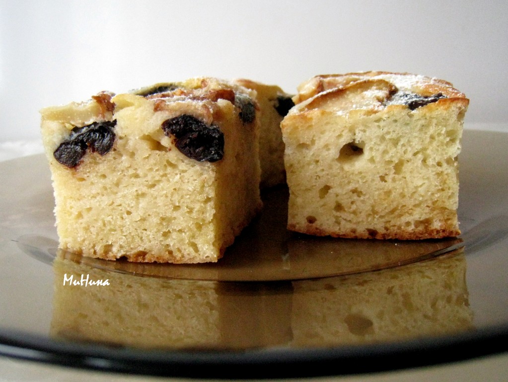 При подаче вкусный, пышный, полезный пирог с творогом и грушами можно посыпать сахарной пудрой.