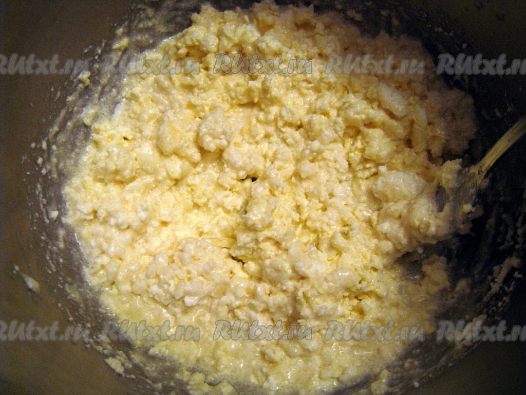 Маргарин растопить и охладить. Соединить и перемешать творог, яйцо, сахар и растопленный маргарин.