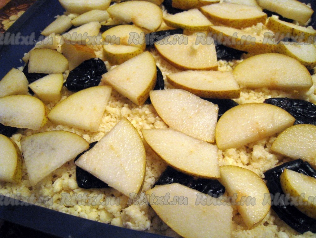 На творожное тесто выложить чернослив и нарезанные дольками груши.