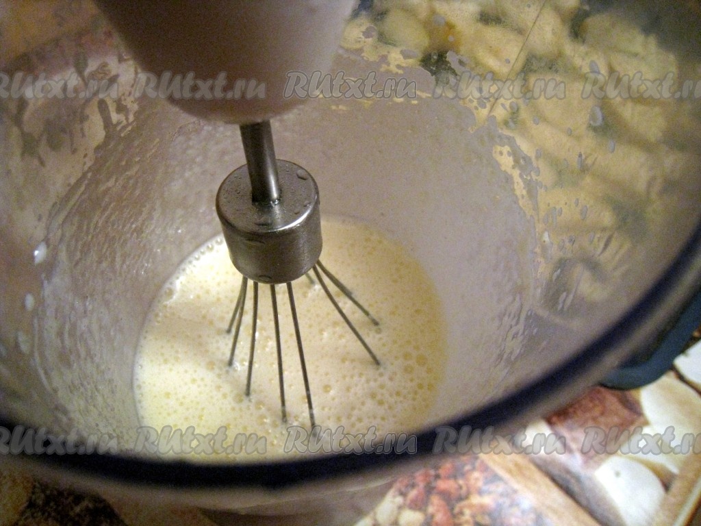 Приготовить сметанную заливку для пирога: взбить миксером яйцо, сметану, сахар и муку.