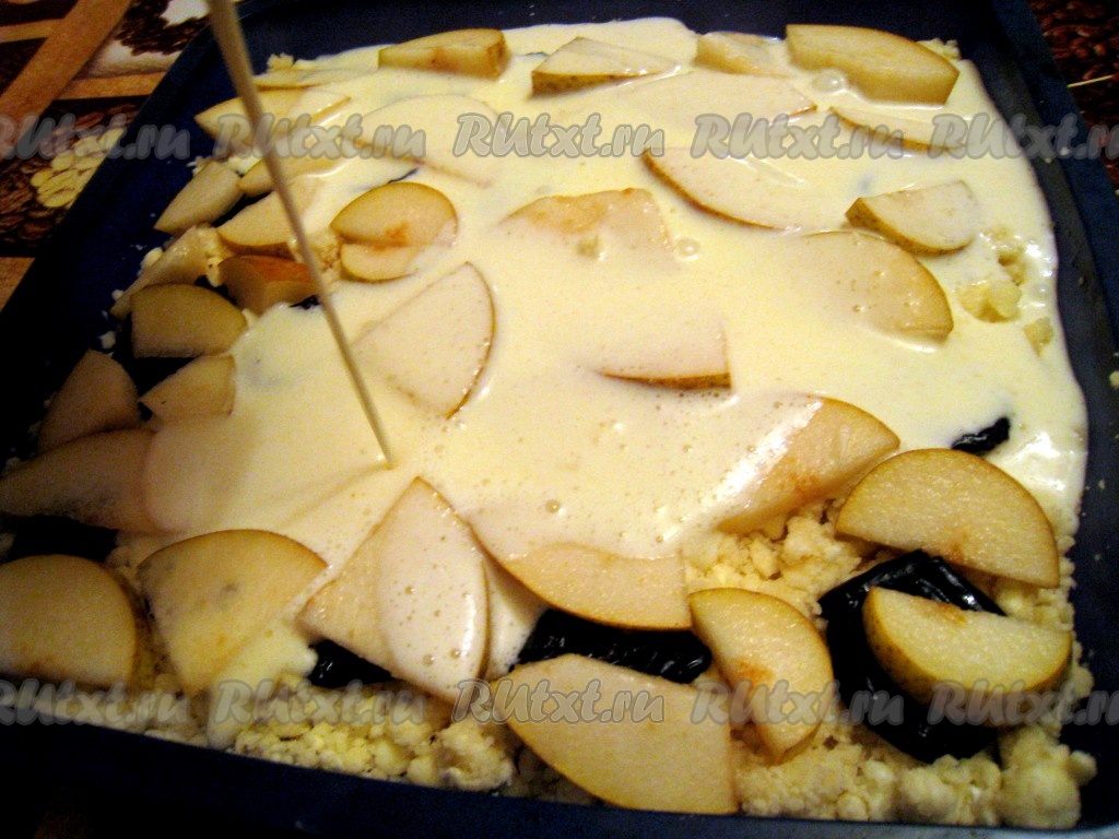 Равномерно вылить на тесто с начинкой заливку. Поставить творожный пирог с грушами в разогретую до 180 градусов духовку и выпекать до готовности, примерно 40 минут (время приготовления очень сильно зависит от свойств духовки и формы).