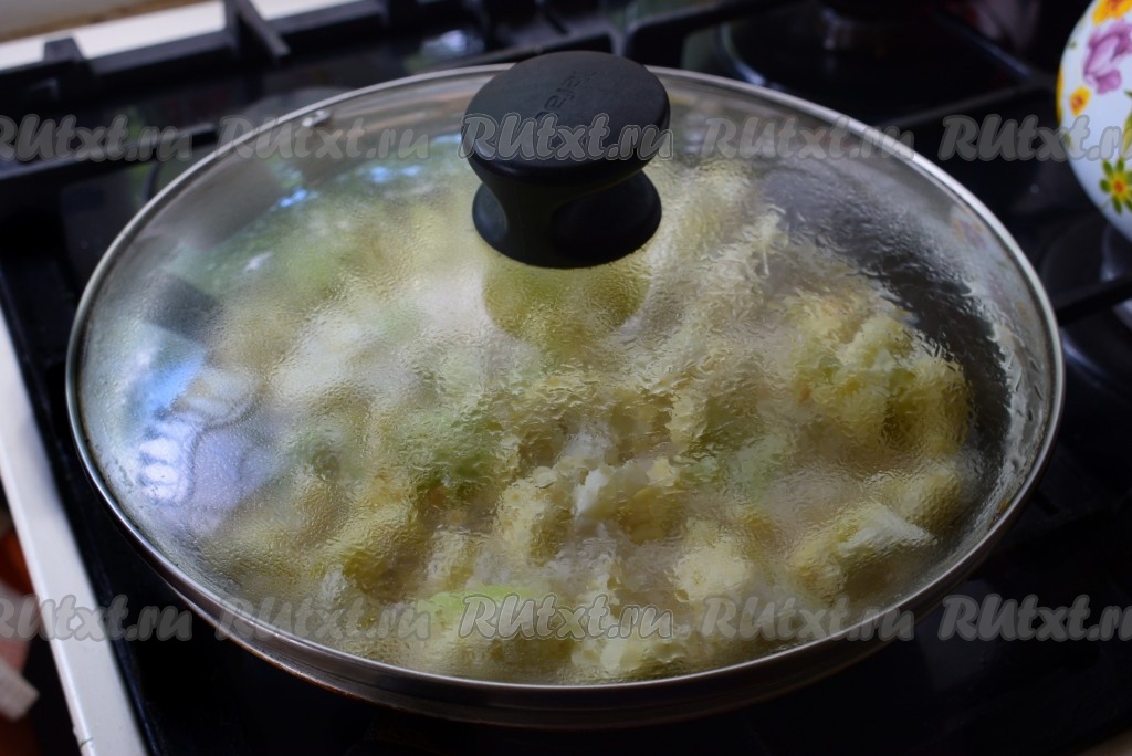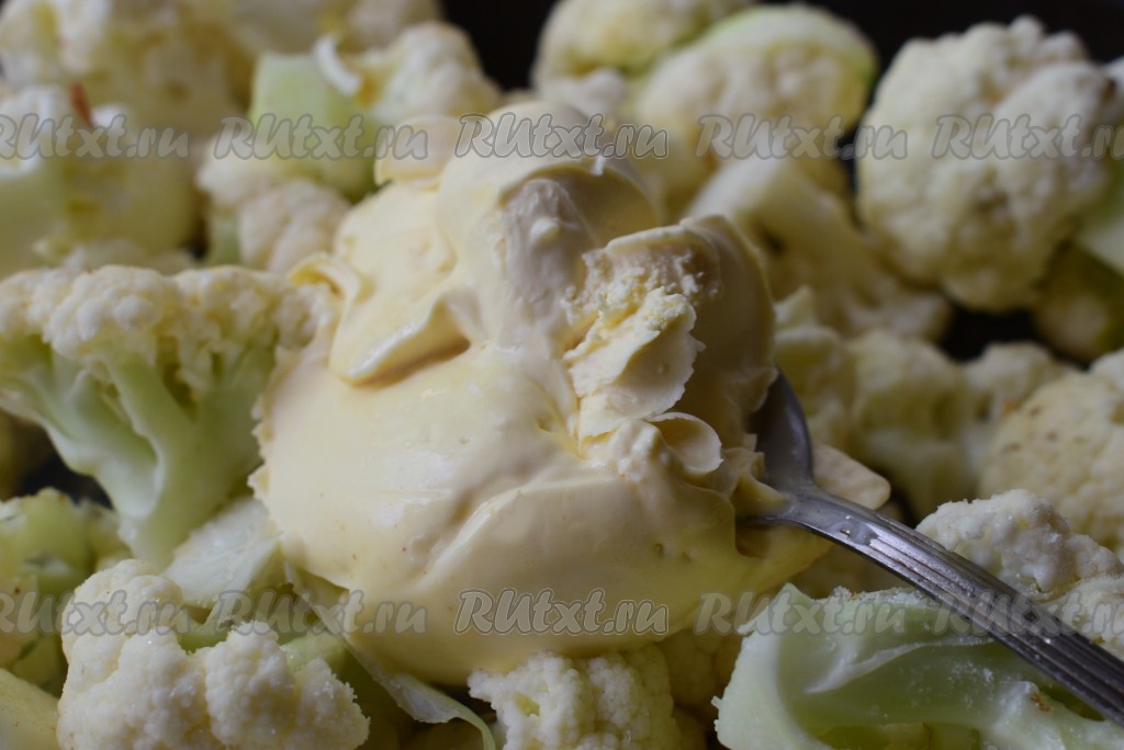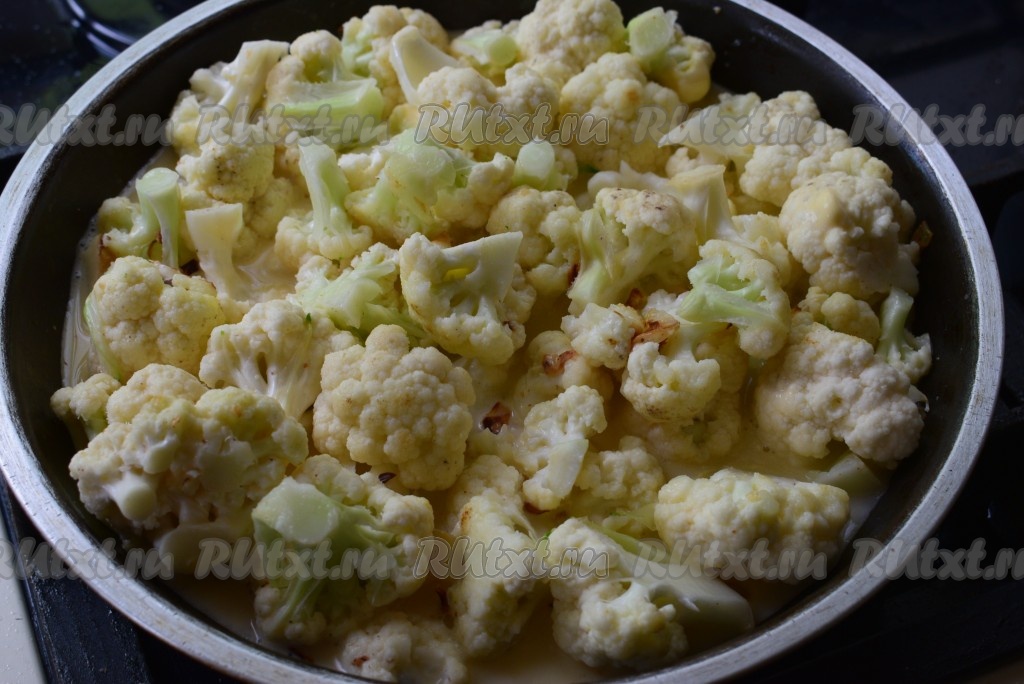 Накрыть крышкой и тушить цветную капусту в сметане до готовности (примерно, 15-20 минут). Время приготовления зависит от сорта капусты, тут главное не перетушить, чтобы она осталась плотной, а не стала мягкой.