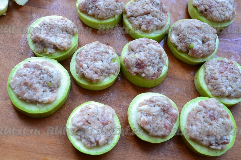 Наполнить отверстия кабачков фаршем так, чтобы он покрыл и верхнюю часть кружочков.