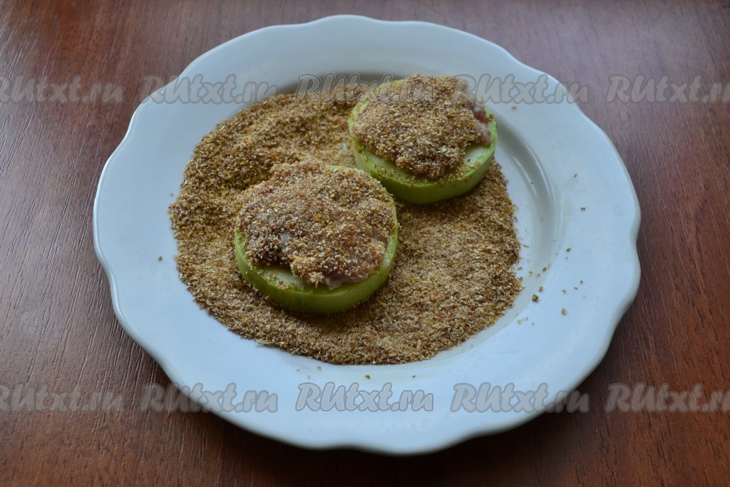 Обвалять кабачки, фаршированные мясным фаршем, с двух сторон в панировочных сухарях.