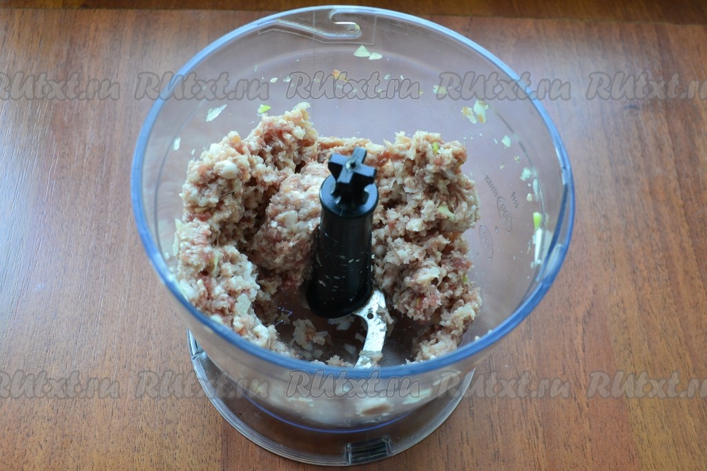 Измельчить мясо с луком на высокой скорости до состояния фарша. Можно мясо с луком измельчить в мясорубке.