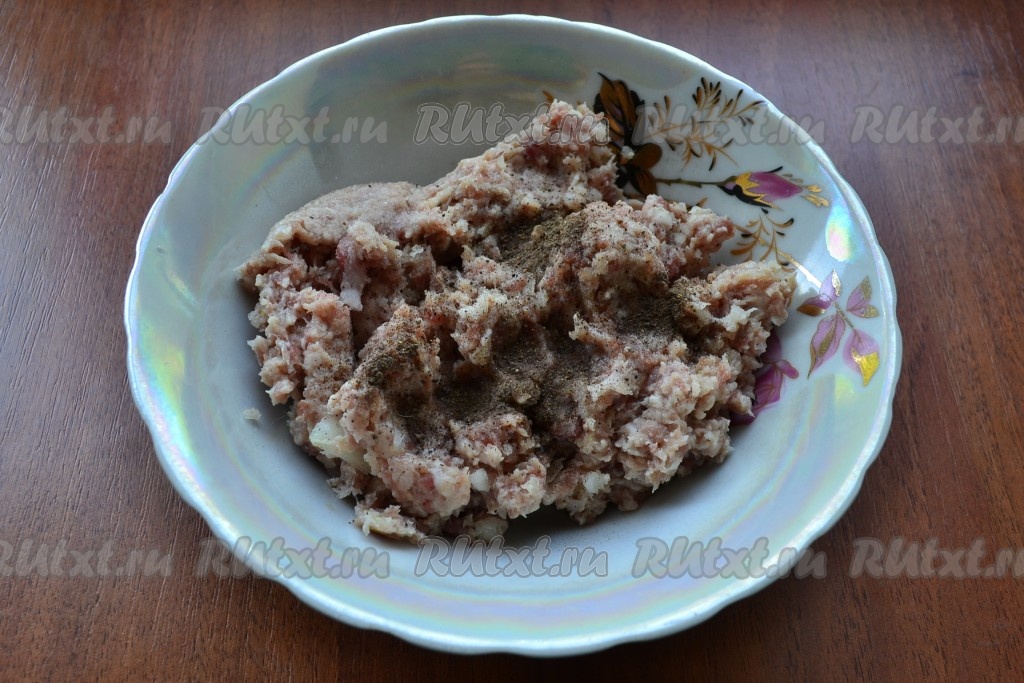 Получившийся мясной фарш посолить, поперчить, тщательно перемешать.