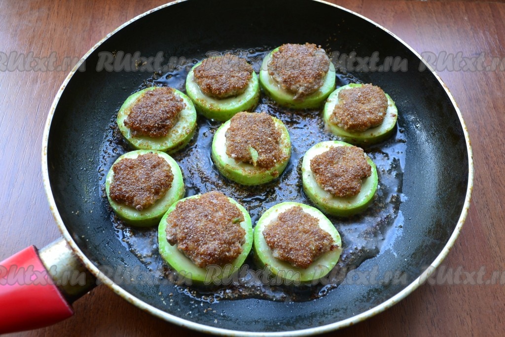 Далее выложить кружочки кабачков с фаршем в один слой на сковороду, разогретую с растительным маслом, и обжарить на среднем огне до румяности с двух сторон.