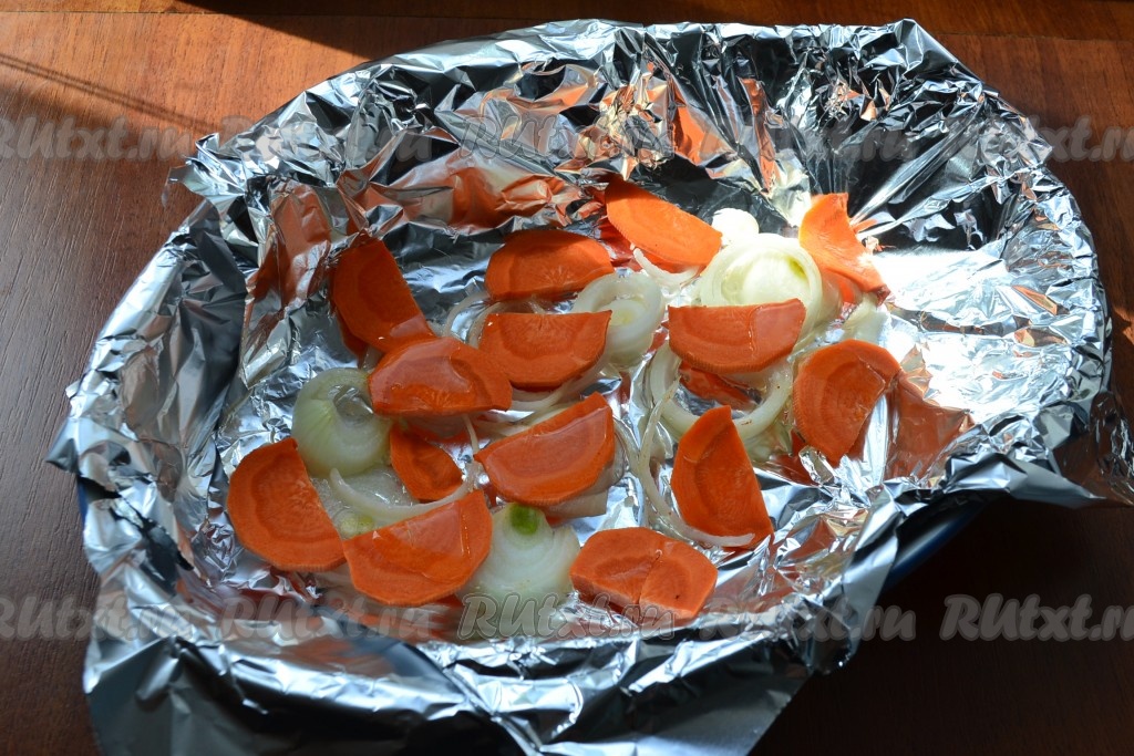 Форму для запекания застелить фольгой, влить растительное масло и разместить на дне нарезанные лук и морковь.