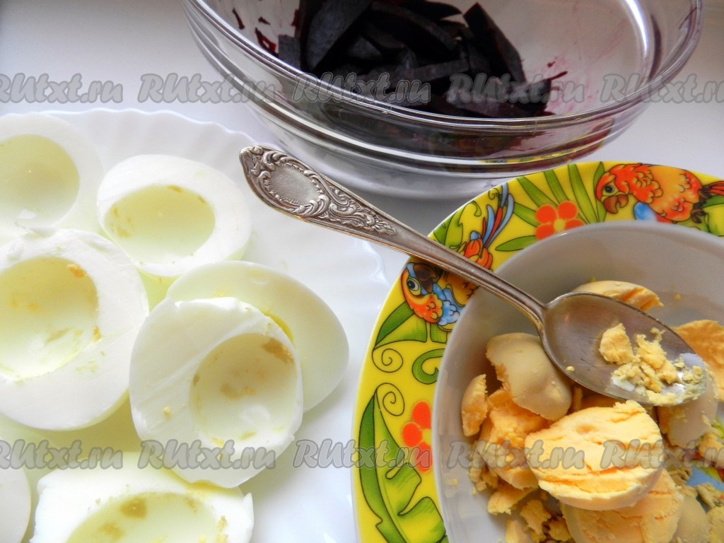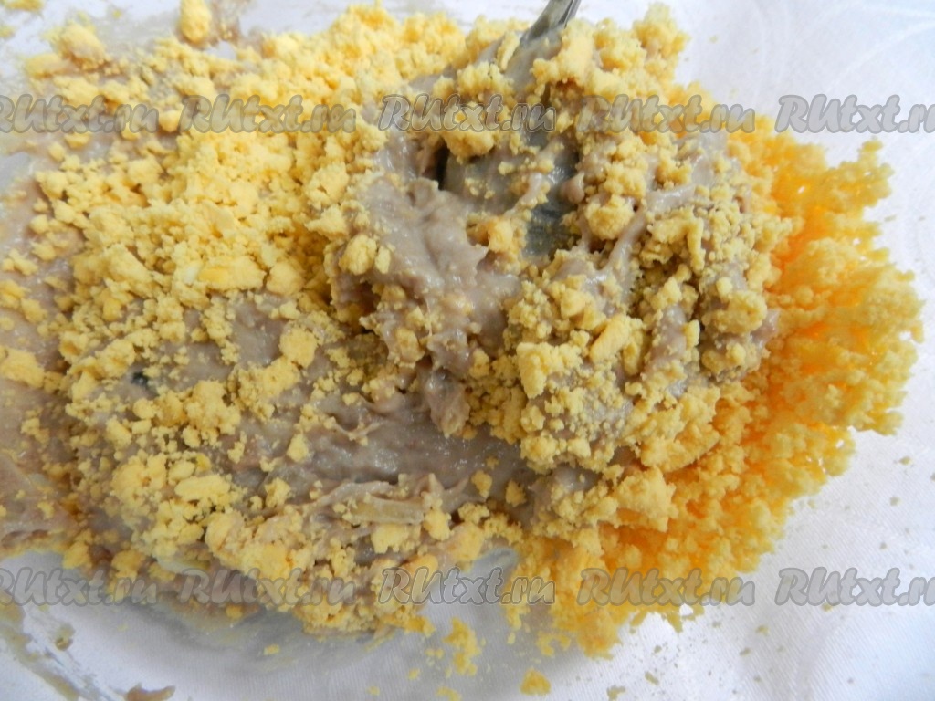 Яйца сварить вкрутую (варить 10 минут с начала кипения воды), очистить, разрезать пополам. Вынуть желтки и в отдельной миске хорошо размять вилкой.