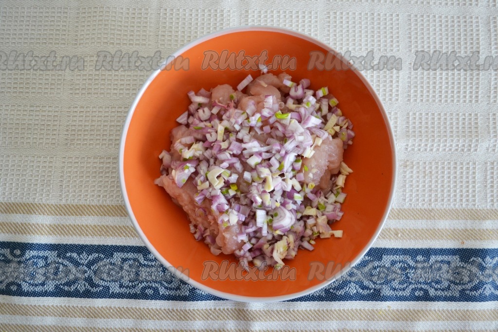 Очищенный лук и чеснок мелко нарезать и добавить к мясу.
