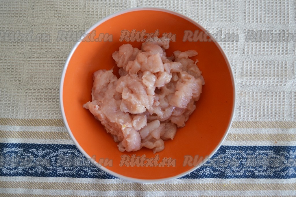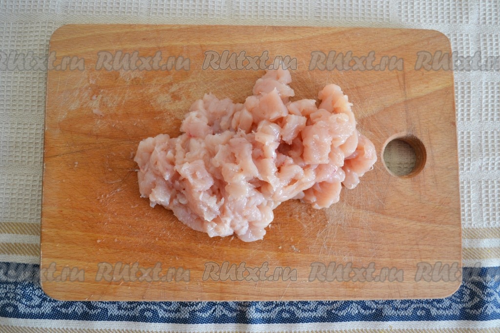 Куриную грудку (или другое мясо) вымыть, обсушить салфетками, зачистить от пленок и прожилок, а затем мелко-мелко нарезать.
