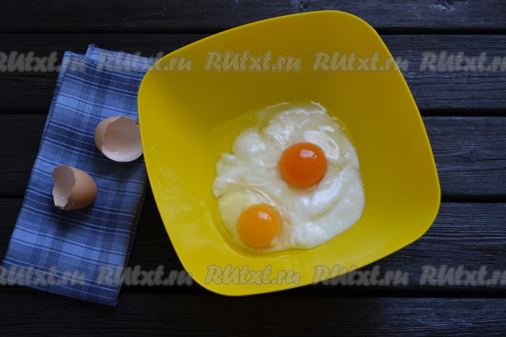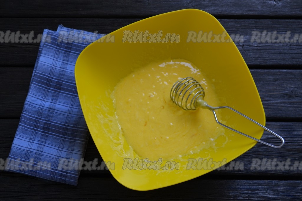 Взбить смесь кефира, масла и яиц венчиком до однородности.