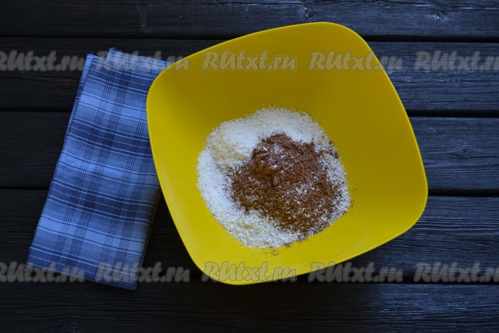 В отдельной миске соединить просеянную муку, сахар, разрыхлитель и какао, всыпать, по желанию, кокосовую стружку, перемешать сухие ингредиенты.