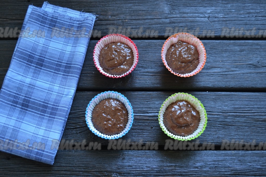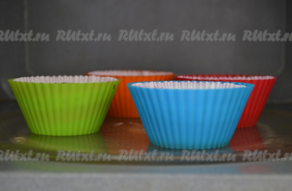 Если у вас плотные бумажные формочки, то их можно сразу использовать. У меня были бумажные вкладыши, их нужно вложить в силиконовые формочки для маффинов, чтобы вкладыши держали форму. Разложить тесто в бумажные формы, заполняя их чуть выше, чем на половину объёма. Из данного количества продуктов получится 10 кексов.
