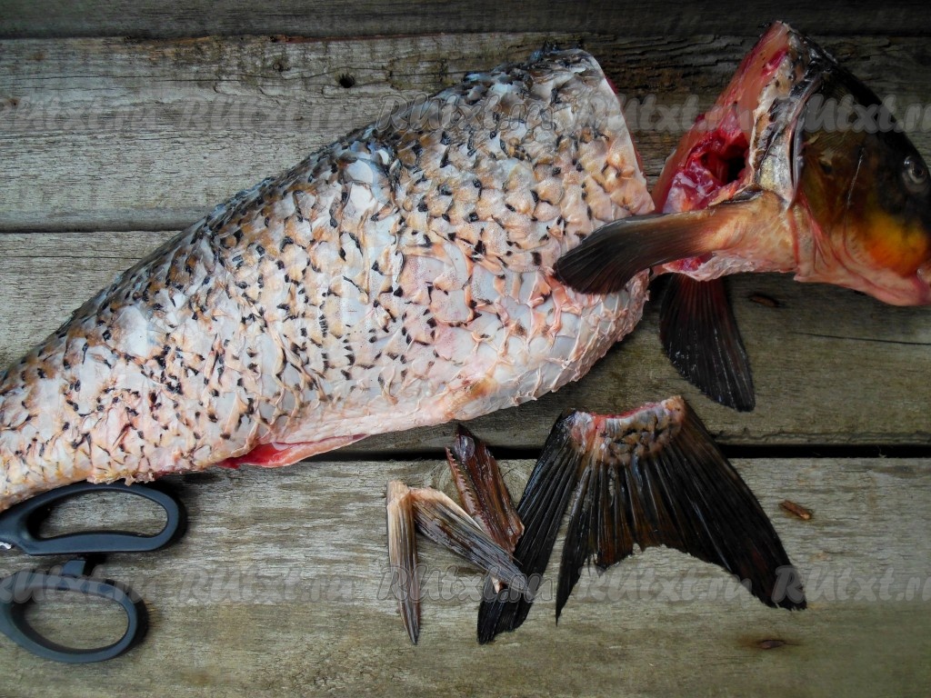 С помощью большого ножа отрежьте голову и хвост рыбы, срежьте плавники (я срезаю плавники кухонными ножницами). Голову я не жарю, она прекрасно подойдет для приготовления первого блюда.