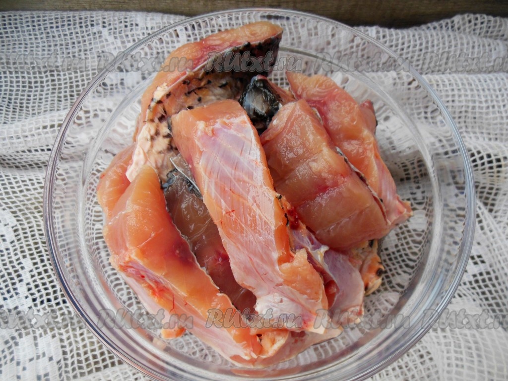 Затем рыбу нарежьте на стейки (порционные кусочки). Если карп крупный, то каждый стейк можно разделить на две части, я так и сделала.