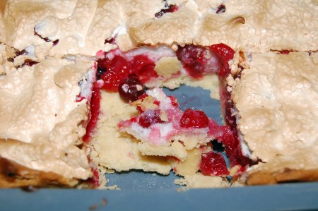Наш вкусный пирог с клюквой и безе готов. Режем его на кусочки и угощаем гостей. Ягодки клюквы внутри пирога остаются целыми и лопаются при поедании. Клюквенный пирог, приготовленный по этому рецепту, получается очень нежным и хрупким, на следующий день он остается таким же вкусным, а безе придаёт ему неповторимое очарование.