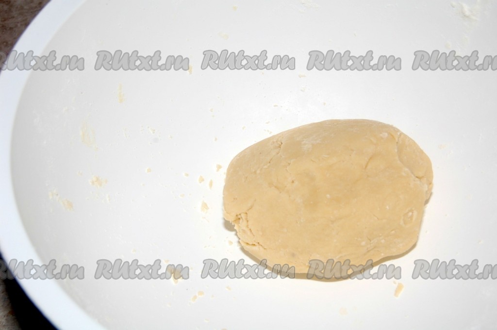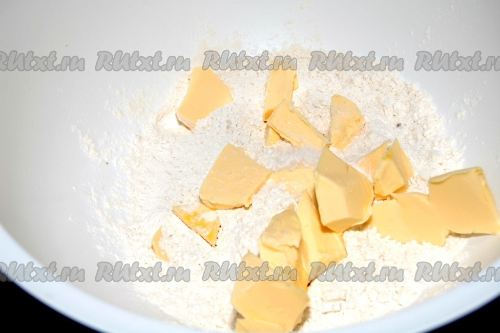 Для приготовления теста соединить масло с мукой и руками растереть сначала в крошку.