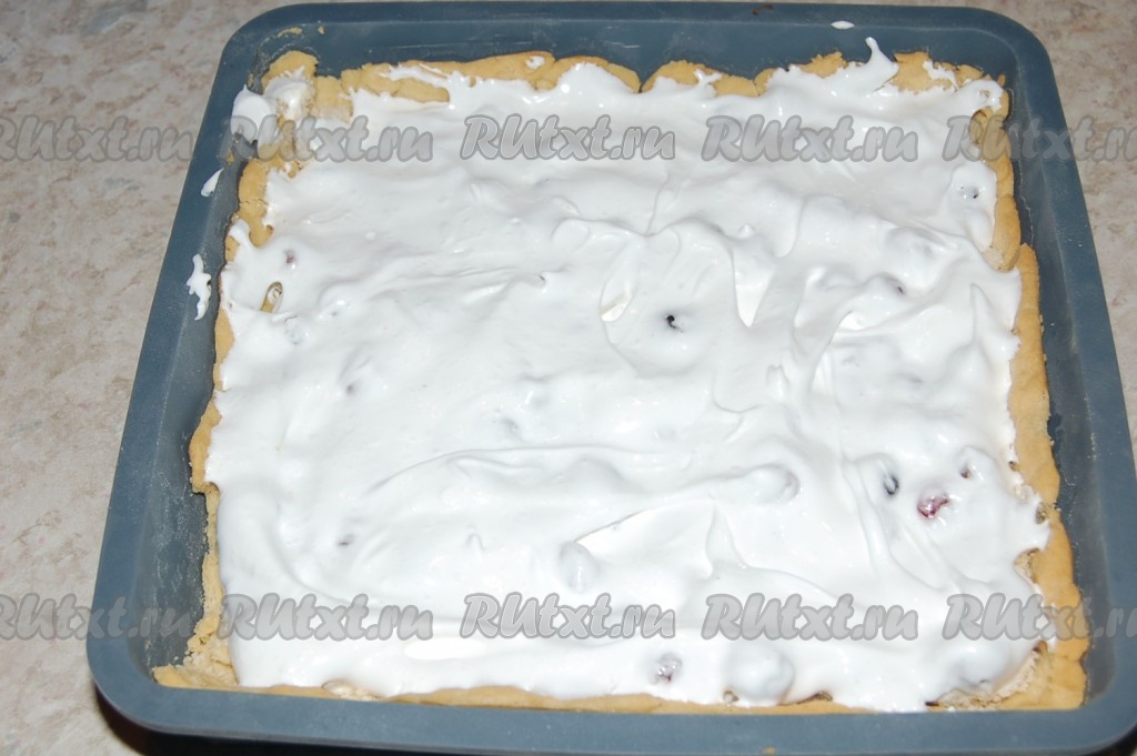 На корж выложить взбитые белки с клюквой. Сверху выложить отложенные взбитые белки (без ягод), это позволит сделать верх пирога более красивым.