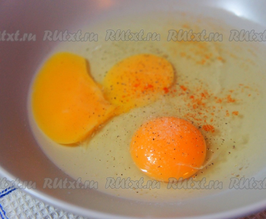 К яйцам добавить немного соли, специй, взбить вилкой.