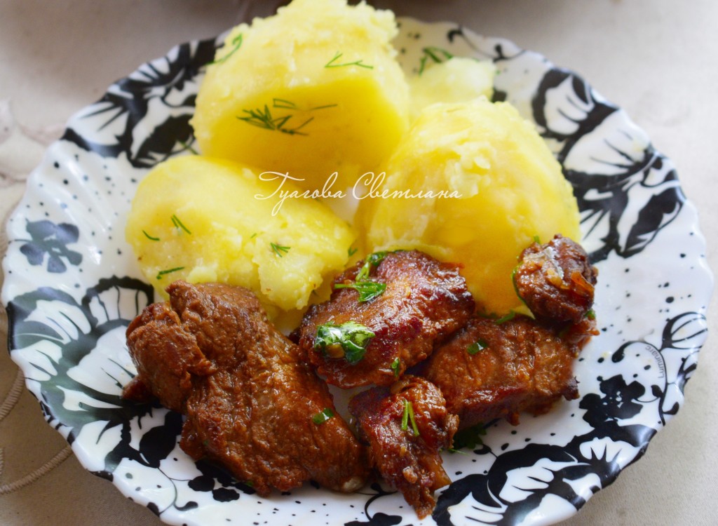 Отключаем режим "Жарка" и включаем режим "Тушение" на 1 час. Добавляем 100 мл кипяченой водой (воды надо совсем немного, чтобы был эффект жареного, а не тушеного мяса), закрываем крышку и тушим 1 час, не открывая мультиварку.