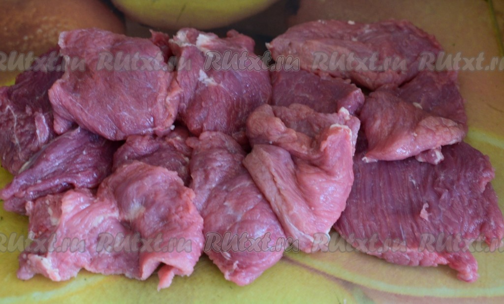 Говядину, очищенную от пленочек, нарезаем на средние плоские кусочки.