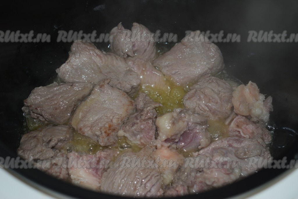 Говядина быстро схватится в разогретом масле и весь сок останется внутри мясных кусочков. Жарим мясо, периодически помешивая, минут 15 с закрытой крышкой мультиварки.