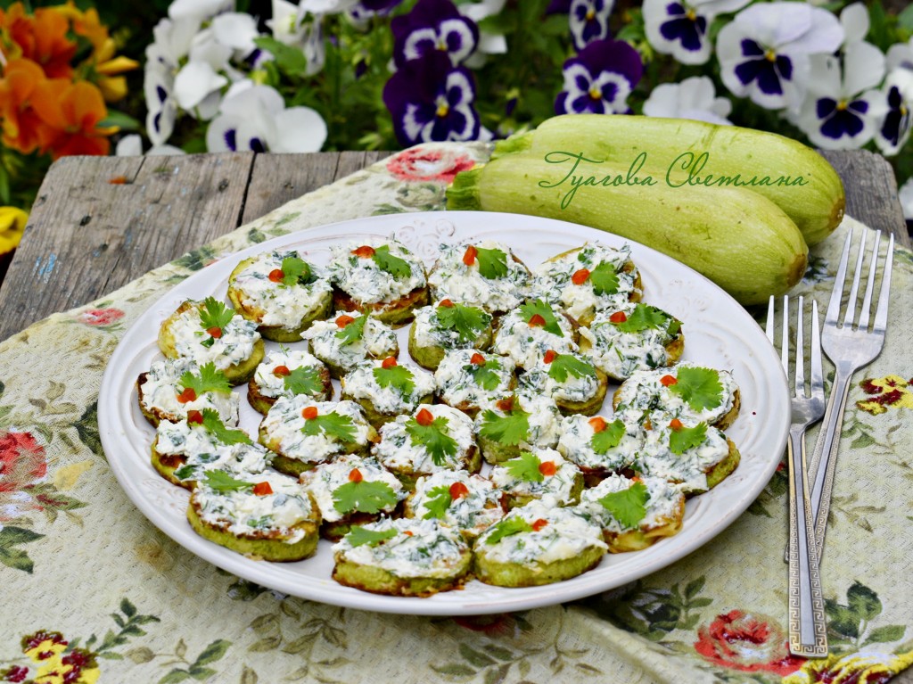 Получившуюся творожную смесь выложить поверх каждого обжаренного кружочка кабачка, украсить листочком зелени и выложить на блюдо. Дать закуске из жареных кабачков и творога настояться в течение минут 20 и подать к столу. Я дополнительно на каждый кружочек сверху для остроты добавила капельку кетчупа чили, но это по желанию.