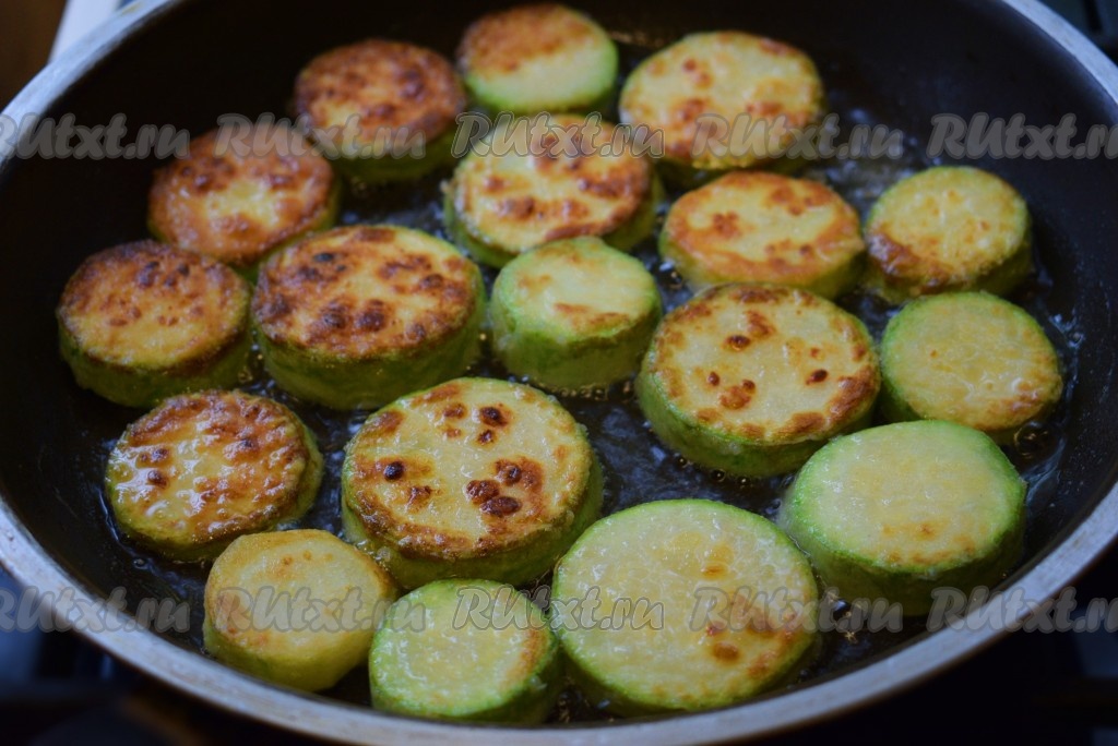 Жарить кабачки на среднем огне с двух сторон до румяной корочки (примерно по 3 минуты с каждой стороны).