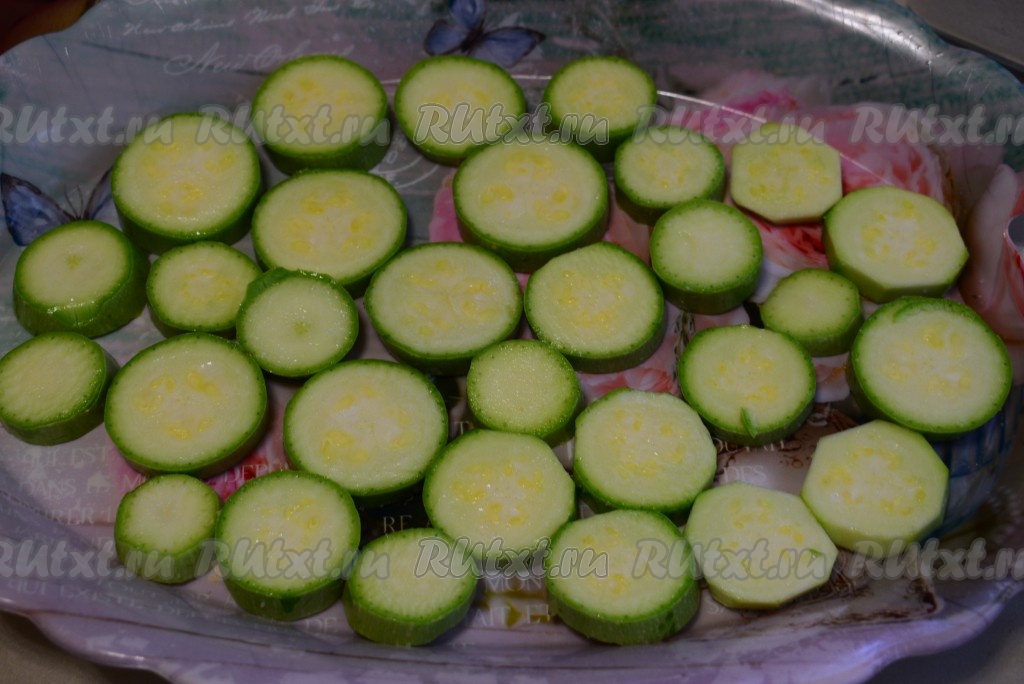 Нарезать кабачки на кружочки толщиной, примерно, 6 миллиметров, посолить и дать полежать 10 минут (за это время на кабачках выступит сок).