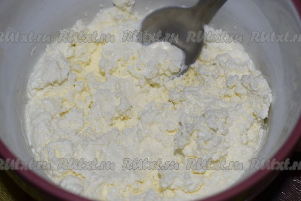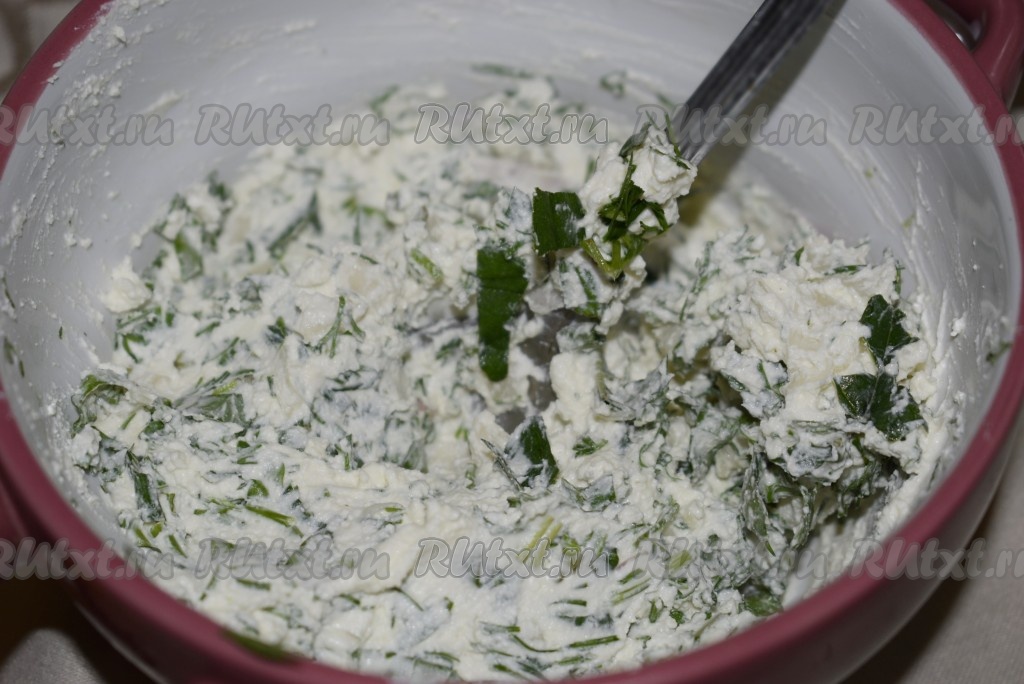 Пока кабачки остывают, приготовим смесь из творога и зелени. Для этого нужно выложить в миску творог, размять его вилкой до однородности, затем добавить сметану, соль, перемешать.