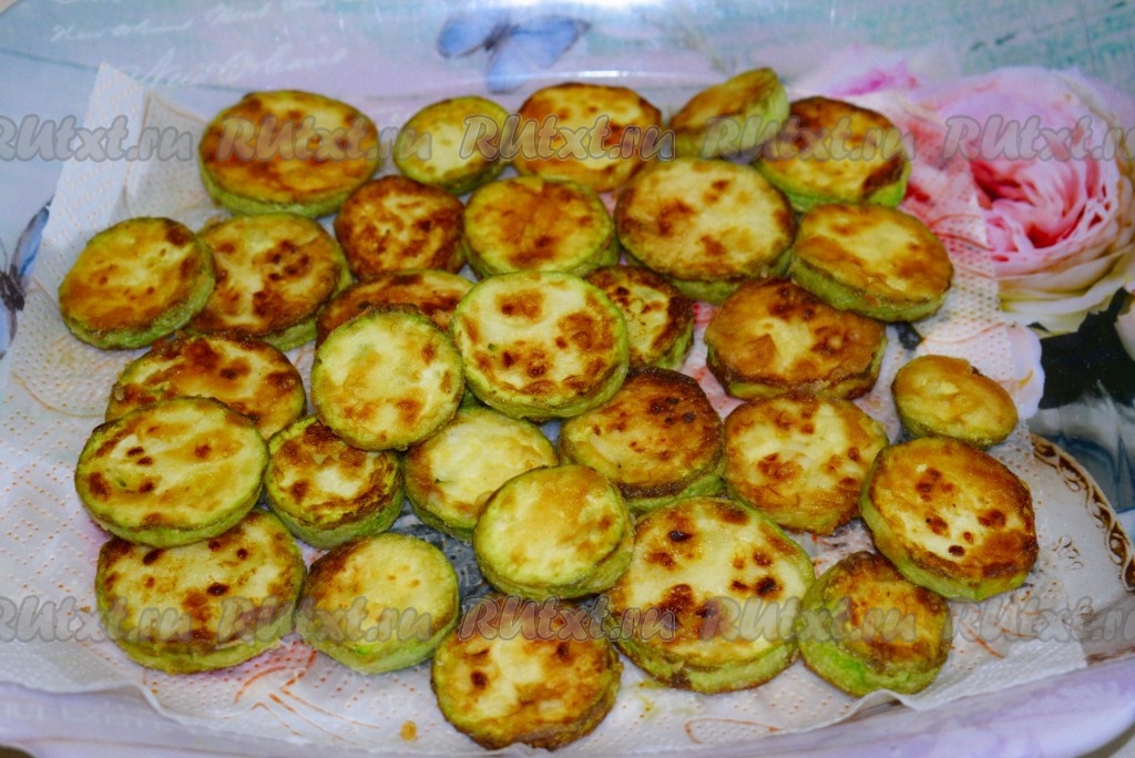 Готовые жареные кабачки со сковороды перекладывать на бумажные полотенца, чтобы удалить лишнее масло. Постепенно, не забывая обваливать в муке, обжарить все кабачки. Дать кабачкам остыть.