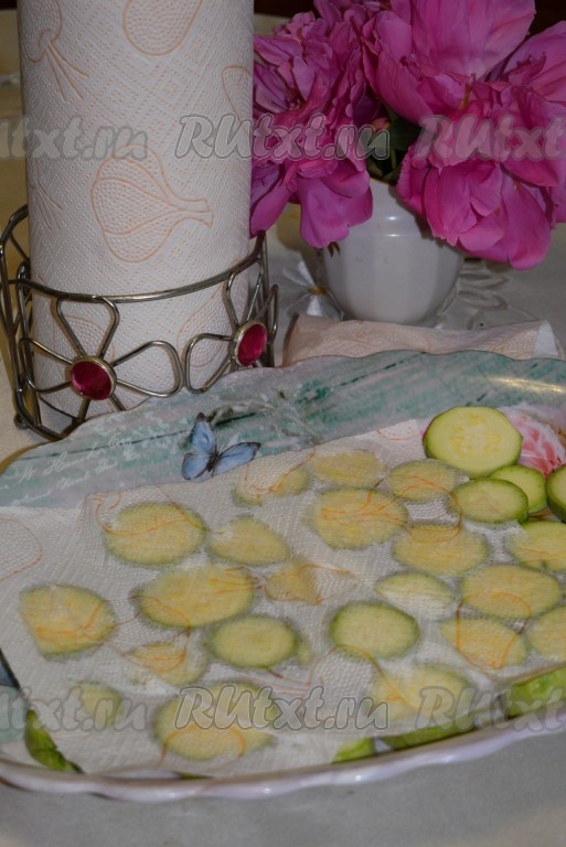 Сок, выделившийся из кабачков, удалить, промакивая кабачки бумажным полотенцем.