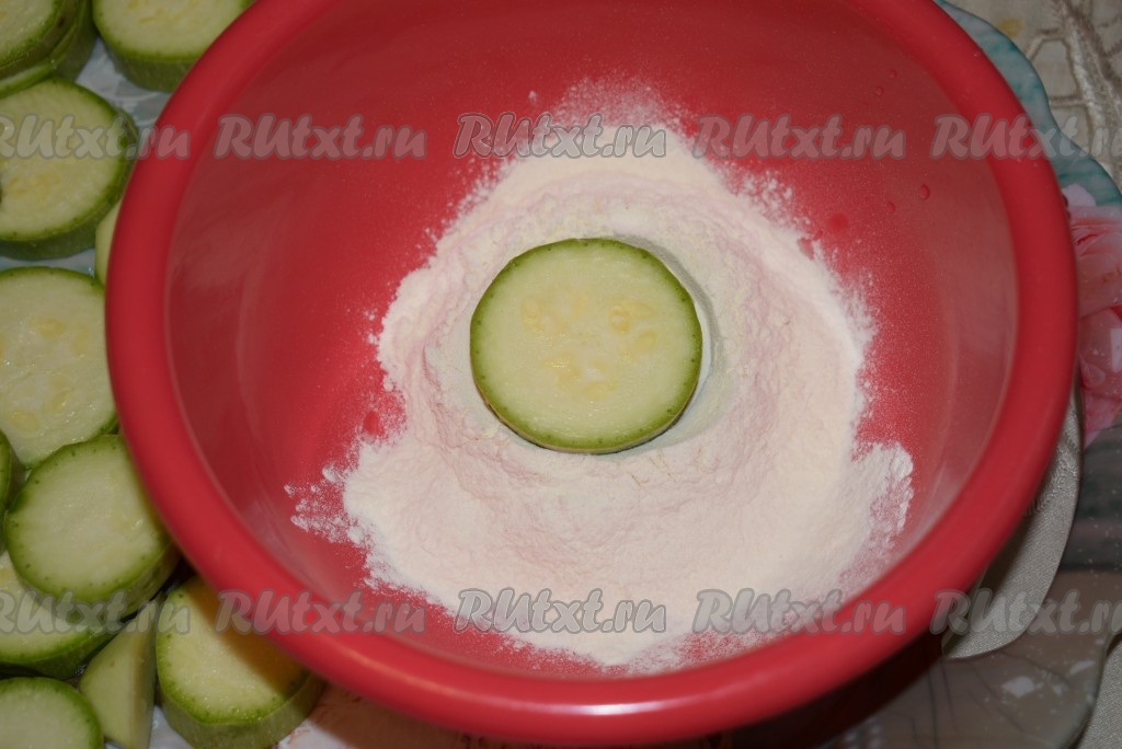 Подготовленные кабачки выложить в миску с мукой. Обвалять кабачки в муке со всех сторон.