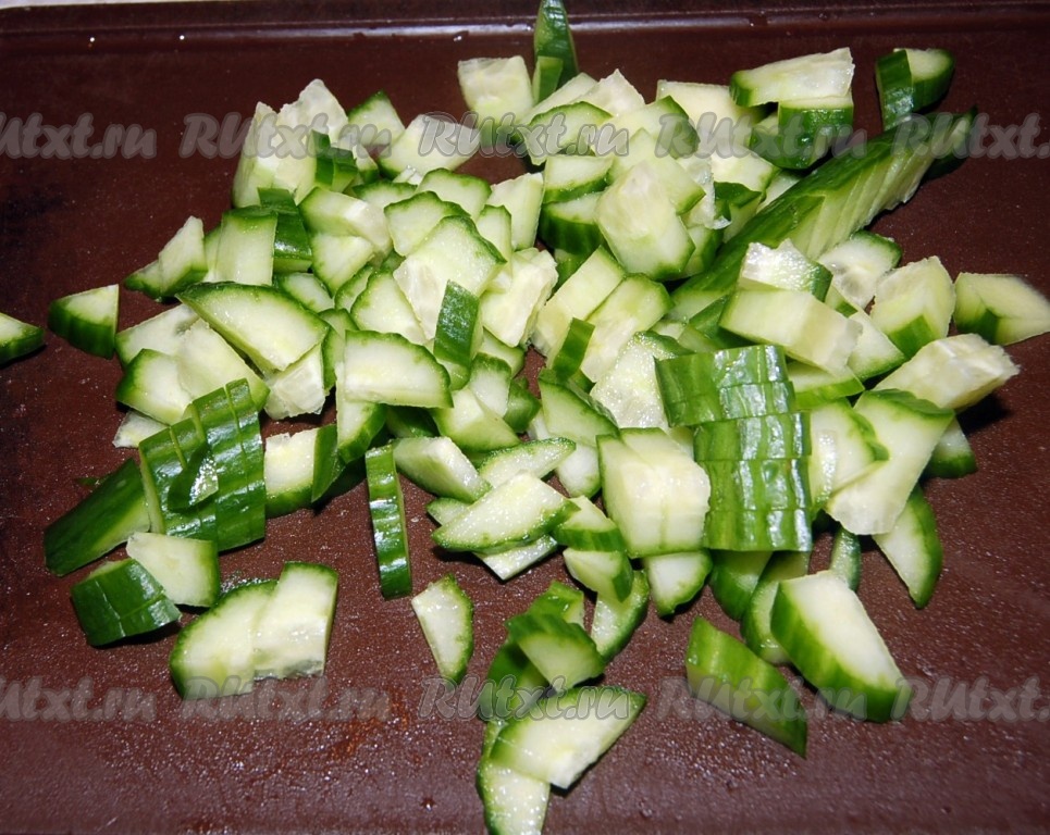 Смешиваем в салатнице мелко нарезанные  овощи (огурец, редиску и помидор).