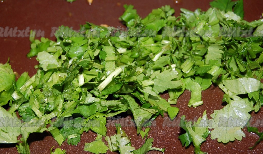 Добавляем в салат нарезанную зелень и сыр Сиртаки. Перемешиваем.