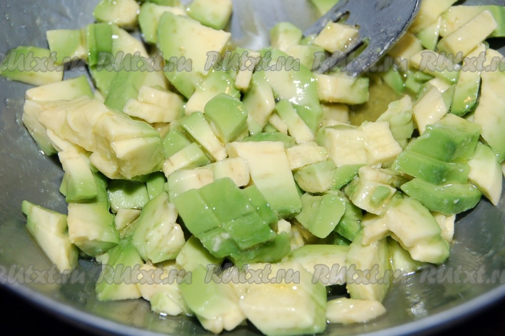 Нарезаем  авокадо для салата небольшими кусочками, складываем в миску, добавляем лимонный сок и оливковое масло, перемешиваем.