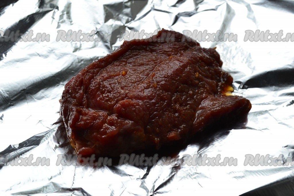 Далее каждый кусок телятины выложить на фольгу, сложенную вдвое.