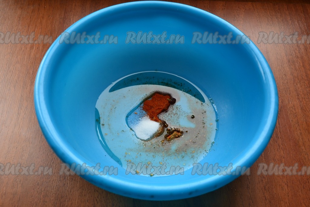 Желательно разделить мясо на 2 части. Растительное масло влить в миску, добавить соль, приправу к мясу и паприку, перемешать получившуюся смесь.