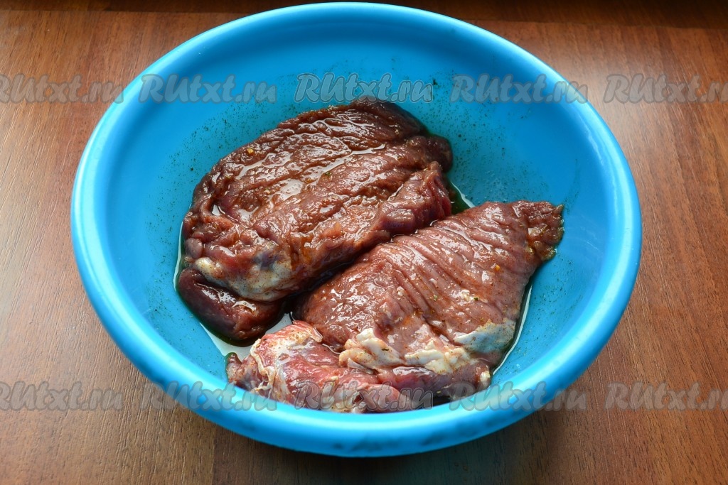 Куски телятины хорошо обмакнуть со всех сторон в подготовленную смесь и оставить для маринования на 3-4 часа в прохладном месте.