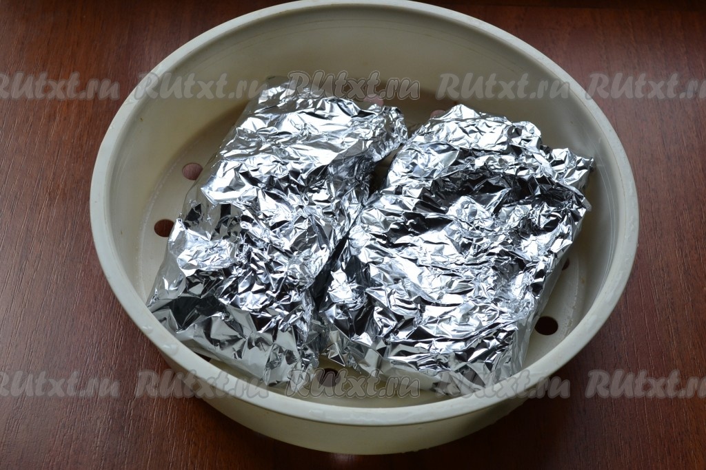 Тщательно завернуть каждый кусок телятины в фольгу и поместить в чашу мультиварки для варки на пару.