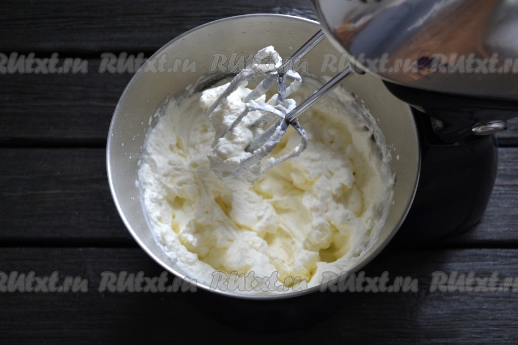 Продолжить взбивать сливки до мягких пиков. На это уйдет, примерно, 4 минуты. Когда на взбитых сливках начнёт оставаться след от венчика - крем готов. После этого нужно прекратить взбивание, чтобы не превратить крем в масло.