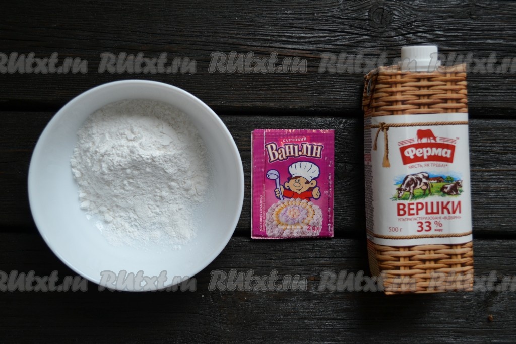 Подготовить необходимые ингредиенты для приготовления крема: сахарную пудру, ванилин и сливки. Сливки должны быть без добавок и ароматизаторов, жирностью не ниже 33%.