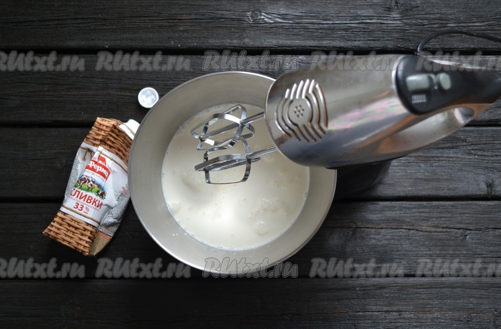 Перед приготовлением крема сливки должны постоять в холодильнике не менее 5 часов. Также остыть должна и посуда: чаша миксера и венчики (их нужно поместить в холодильник за 20-30 минут до начала приготовления). Влить охлажденные сливки в чашу миксера и взбивать на первой скорости миксера ровно 1 минуту.