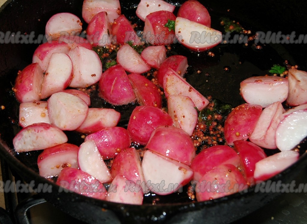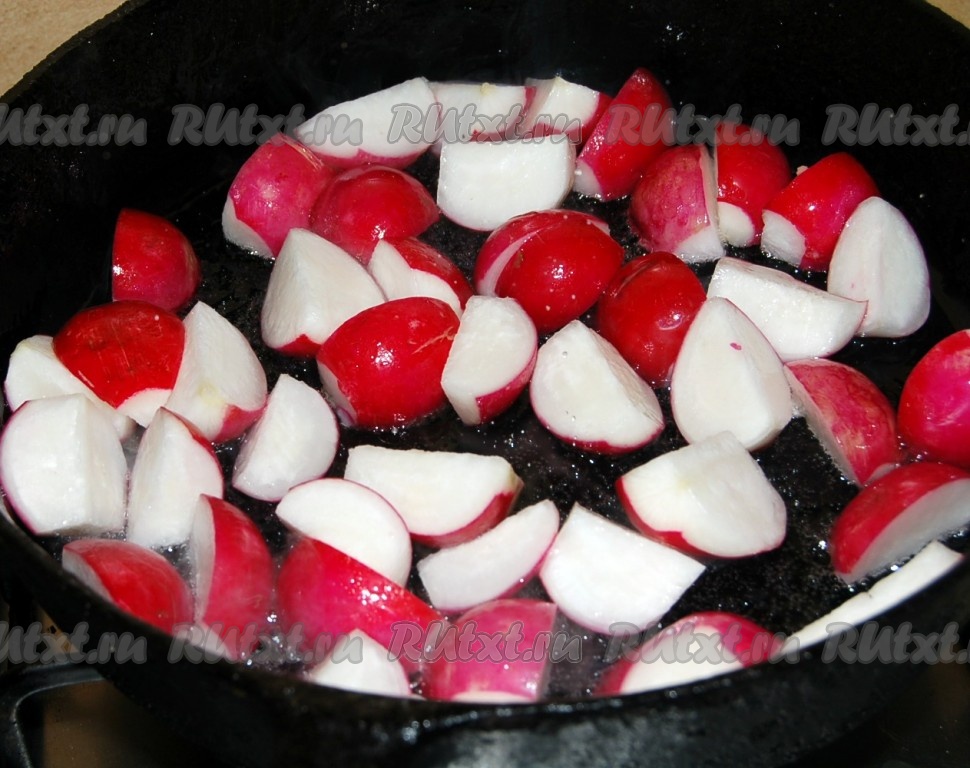Редиску промоем, обсушим и нарежем четвертинками. Разогреем сковороду с маслом и на раскаленную сковороду выложим редиску.